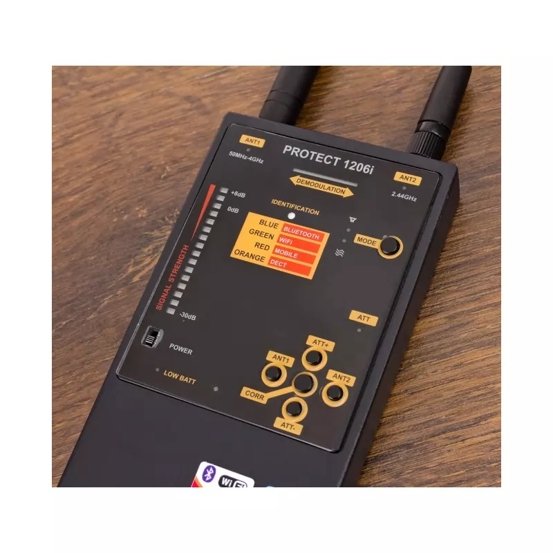 Czy w dobie nowoczesnych, zaawansowanych technologii, można cieszyć się pełną prywatnością? Dzięki takim urządzeniom jak wykrywacz Protect 1206i, jest to jak najbardziej możliwe! Prezentowany w tej ofercie detektor charakteryzuje się wysoką czułością w zakresie wychwytywania sygnałów WiFi oraz Bluetooth. Wykrywacz umożliwia zlokalizowanie ukrytych kamer, nadajników FM oraz innych urządzeń korzystających z sieci WiFi, Bluetooth lub FM. Model Protect 1206i posiada dwie anteny – główną oraz dodatkową – które gwarantują niezwykle szeroki zakres wykrywanych częstotliwości.